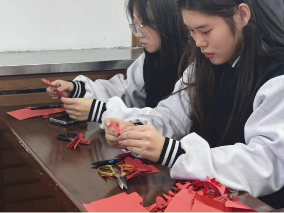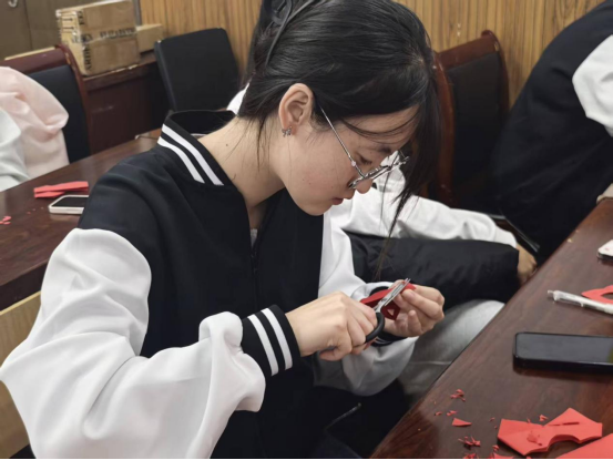 活动现场暖意融融,美术专业教师吕佳讲解剪纸起源与工艺,员工们自备工具创意实操,剪纸声与交流声交织,红纸变佳作,情谊渐浓。