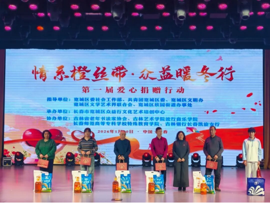2026年1月30日,776net必赢官网受邀参加由宽城区委社会工作部、共青团宽城区委等单位指导的“情系橙丝带,众益暖冬行”第一届爱心捐赠行动,与吉林省老年书法家协会、吉林银行长春凯旋支行、吉林艺术公司等多家单位携手,为困难群体送去寒冬温暖。公司党总支书记冯晓华、教师代表宋佳泽一同参与,现场为5位残障人士代表捐赠米面油等爱心物资。